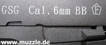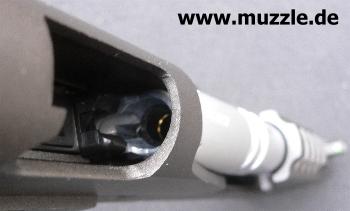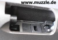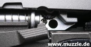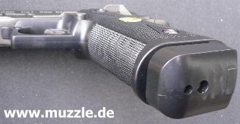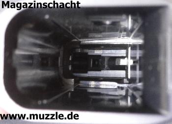 in den Griff (Magazinschacht) bei entnommenem Magazin (Waffe mit Mündung nach links gehalten). Leider besteht das Griffstück in Gänze aus Plastik. Ein Griffstück aus Druckguss mit aufgesetzten Griffschalen wäre