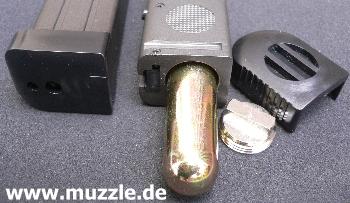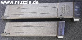 Magazinmodul erhältlich, in das eine CO2-Kartusche eingesetzt werden kann. Wegen der Abmaße dieser Kapsel fällt das CO2-Magazin länger aus und steht unten deutlich weiter aus dem Griffstück heraus. Was den einen