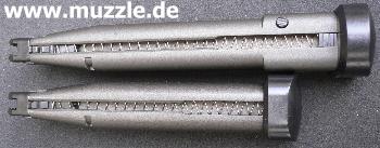 Bild unten links: Die unterschiedlichen Magazine im Längenvergleich. Bild unten rechts: Beim CO2-Magazin lässt