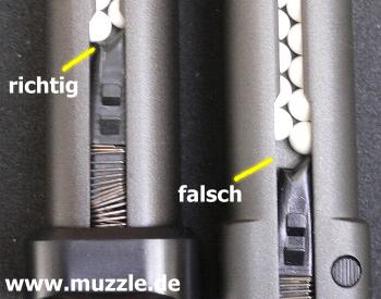 ölen. Ohne diese Maßnahme entstanden immer wieder Leerschüsse, da sich die Kugeln im Magazin stauten und von der Magazinfeder selbsttätig nicht zu bewältigen waren, besonders beim längeren CO2-Magazin. Nach der