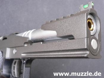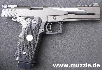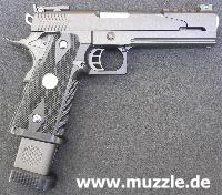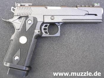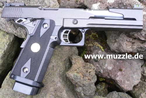 Die “HiCapa Dragon” Pistole ist optisch ganz auf eine sportliche Großkaliberwaffe getrimmt, wie sie bei den