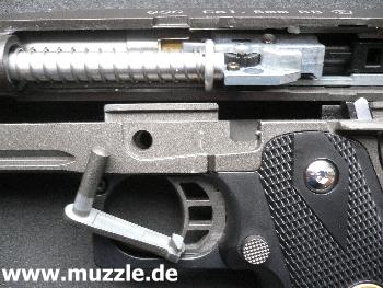 befindet sich am Griffrücken (verbunden mit dem Beavertail) eine sogenannte Handballensicherung (Bild unten links). Erst wenn diese beim Umschließen des Griffstücks durch die Schusshand eingedrückt wird, lässt sich der