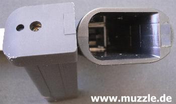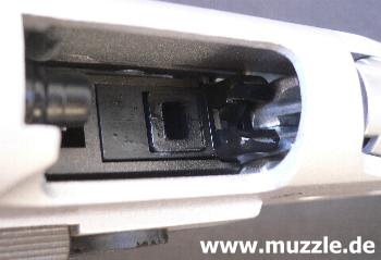 Bild unten links: Blick in das Patronenauswurffenster auf das leere Magazin. Bild unten rechts: Blick von unten in den Griff (Magazinschacht) bei entnommenem Magazin (Waffe mit Mündung nach links gehalten). Leider besteht das Griffstück in Gänze aus Plastik. Ein Griffstück aus Druckguss mit aufgesetzten Griffschalen wäre schöner. Dann wäre es möglich die Plastikgriffschalen bei Bedarf gegen solche aus Holz, Perlmutt oder anderen hochwertigen Werkstoffe auszutauschen.