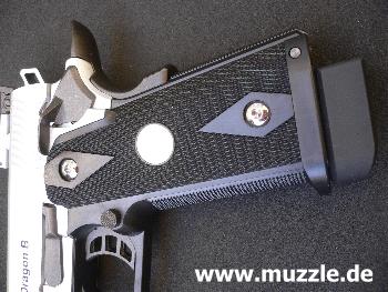 Die “HiCapa 7 Dragon B” Pistole ist optisch ganz auf martialisch anmutende Großkaliberwaffe getrimmt. Der geteilte und skelettierte Schlitten in Verbindung mit der vorne gefrästen Mündungsansicht des Laufgewichtes bewirken ein geradezu aggressives Erscheinungsbild. Der Beavertail)* und die großen Sicherungsflügel sind Anleihen vom Colt Government 1911A. (Bilder unten) )* Beavertail = Handschutz oberhalb des Griffrückens, der die Schusshand vor Verletzungen durch den repetierenden Schlitten und den gespannten Hahn schützt, bzw. der verhindert, dass die Hand u. U. versehentlich die Waffenfunktion beeinträchtigt.
