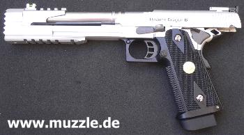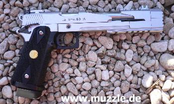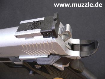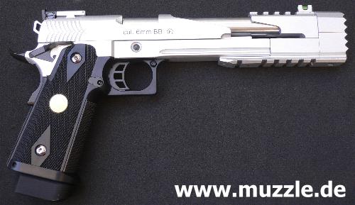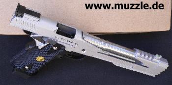Fazit: Für Liebhaber großformatiger schwerer Kurzwaffen ist diese Softair-Pistole sicherlich ein absolutes Muss. Verabeitungsqualität und Funktionalität sind sehr gut. In Verbindung mit dem authentischen Gewicht und den durchaus guten Schusseigenschaften kann man die Waffe jedem Actionschützen empfehlen. Das feine Nickelfinish in Verbindung mit den aggressiv anmutenden Stylingelementen macht die Waffe zu einem absoluten Hingucker. Verarbeitungsqualität und Funktionalität sind sehr gut. Eine positive Erwähnung muss auch das der Waffe beiliegende Manual von UMAREX finden. Es ist ausführlich und sehr anschaulich gestaltet. GUNIMO April 2007