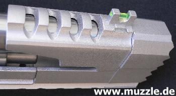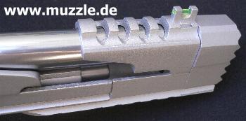 Visierung: Die “HiCapa 7 Dragon B” ist mit einer seiten- und höhenverstellbaren Kimme bestückt. Das Korn besteht aus umge bungslichtbündelndem Kunststoff wodurch ein selbstständiger Leuchteffekt entsteht. Dadurch wird das Zielen auch bei nicht perfekt ausgeleuchtetem Schießstand erleichtert.