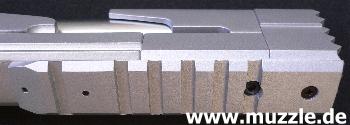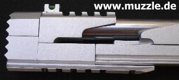Schlittenfang: Die Pistole ist mit einer Schlittenfangvorrichtung ausgerüstet. Nach dem letzten Schuss rastet der Schlitten in der hinteren Position ein und zeigt dem Schützen an, dass das Magazin entleert ist. Bild unten links: Der Schlittenfanghebel greift in die vorgesehene Aussparung am Schlitten und hält diesen gefangen. Bild unten rechts: Schlitten in gefangener Position.