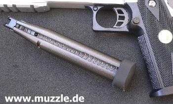 Visierung: Leuchtkorn aus lichtbündelndem Kunststoff, Kimme horizontal und vertikal justierbar Sicherung: Handballenabzugssicherung und manueller Schwenkhebel (beidseitig), mit dem man den gespannten Hahn sperren kann Funktionalität: Alle Bedienteile sind mit der Originalffunktionalität belegt Ausführung: Schlitten und Rahmen Druckguss mit Nickelfinish, Lauf Messing, Laufmantel Aluminium, Griffstück Plastik Lieferumfang: Waffe im Pappkarton, Manual, Inbusschlüssel Zubehör: CO2-Magazin (Bild unten rechts) Preis: ca. 140,- EUR als GBB Zum Manual <--- klick