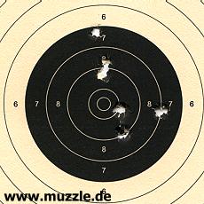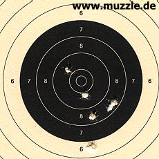 Testbedingungen: Kugeln cal. 6 mm mit 0,25g, Schussdistanz 6 m, offene Visierung, gut ausgeleuchteter Kellerschießstand . Die Präzisionsunterschiede zwischen den beiden Gasmagazinen waren insgesamt marginal, mit etwas plus beim CO2. Die entwickelte Schussenergie trennt da allerdings schon deutlicher. So vermochten die mittels CO2 beschleunigten Kugeln handelsübliche Getränkedosen mit Einschusslöchern zu versehen, während GBB nur Dellen verursachte. Allerdings gebe ich zu bedenken, dass zur Trefferanzeige ein Umwerfen des Zieles ja allemal ausreicht. Der auf die Schusshand übertragene Blowback-Impuls ist dementsprechend bei eingelegtem CO2-Magazin natürlich auch stärker, was ein etwas realistischeres “Rückschlaggefühl” vermittelt, da die Waffe stärker aus dem Zielanschlag springt. Kritiker der CO2-Verwendung weisen in diesem Zusammenhang dann gerne auf den stärkeren Verschleiß durch höhere mechanische Belastung hin. Die Klappziele im Magnet- pendelkasten vermochte man mit keiner des Gasoptionen auf die Magnete zu werfen. Das Für oder Wider GBB, bzw. CO2, ist nach meiner Überzeugung weniger in der Präzisionsaussage zu suchen, sondern eher im Bereich der Reichweite und den Begleitumständen im Schießbetrieb, sowie beim Handling. Da ist CO2 im Vorteil. Die sattere Schussabgabe, mit entsprechendem Impuls, sprechen nach meinem Empfinden ebenso für CO2 wie die Details im Umgang mit dem Magazin selber (siehe oben). Das Treibmittel ins Magazin zu bringen, geht beim Gastank schneller als bei CO2, dafür wird der höhere Aufwand aber mit größerer Kapazität belohnt. Das wegen der Kohlendioxidkartuschendimensionen weit aus dem Griff herausragende Magazin ist hingegen optisch sicher nicht jedermanns Sache. Letzten Endes ist das ganze wohl eine Frage der subjektiven Philosophie des Anwenders und nicht zuletzt auch der eigenen Bevorratung. Wer aus der Softair-Ecke kommt, wird lieber den gewohnten GBB-Weg gehen, der Druckluftschütze greift gerne zum CO2, welches er ja gemeinhin auch für seine CO2-Waffen im Kaliber 4,5 mm griffbereit hält. Nachfolgend einige Zielscheiben (17 x 17 cm) aus den Testdurchgängen, aufgelegt gehaltene Waffe: Greengas, langsame Schussfolge, je 6 Schuss: