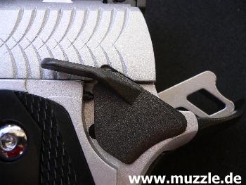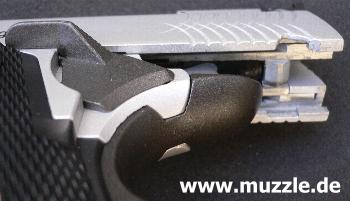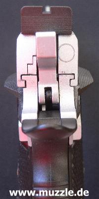 Abzug: Das durchbrochene halbmondförmige Abzugszüngel dreht sich beim Betätigen nicht um eine Achse, sondern gleitet dem Fingerdruck folgend nach hinten. Es handelt sich hier um einen SAO-Druckpunktabzug mit sehr geringem Vorzugsweg. (Bilder unten)