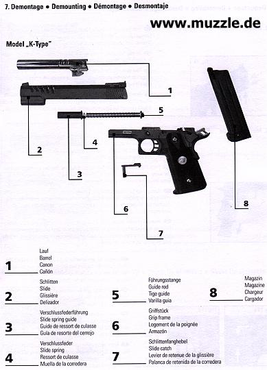 Kaliber: 6 mm BB System: GasBlowBack (GBB), bzw. CO2-BlowBack, HopUp)* justierbar )* HopUp = Vorrichtung (Walzen am Laufansatz) in Softairwaffen, die abgefeuerte BBs in eine Rotations- bewegung versetzt. Das dadurch herbeigeführte strömungsgünstigere Verhalten der Geschosse hat eine stabilere Flugbahn, bessere Präzision und eine größere Reichweite zur Folge. Antrieb: Greengas, Redgas o. ä. bzw. alternativ 12g-CO2-Kartusche (bei speziellem Magazin) Magazinkapazität: GBB = 23 Schuss, CO2= 36 Schuss Schussausbeute: ca. eine Magazinfüllung mit Greengas - 2,5 Magazine mit einer 12g-CO2-Kapsel Lauf: innen glatt (ohne Züge)