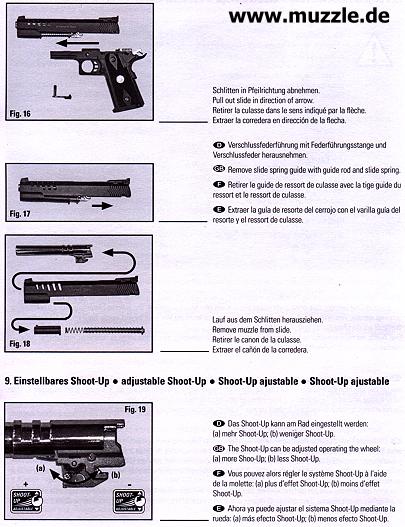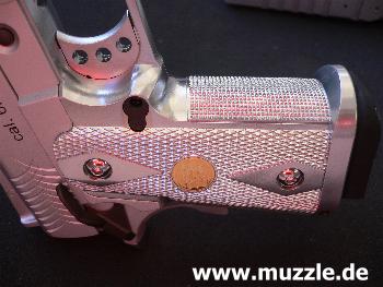 Fazit: Für meinen Geschmack ist das kompakte Governmentimitat ein absolutes Schmuckstück. Das Nickelfinish in Verbindung mit den silbernen Griffschalen generiert ein geradezu edles Erscheinungsbild. Verarbei- tungsqualität und Funktionalität sind sehr gut. In Verbindung mit dem authentischen Gewicht und den durchaus guten Schusseigenschaften kann man die Waffe jedem Actionschützen für das Plinking empfehlen. Eine positive Erwähnung muss auch das der Waffe beiliegende Manual von UMAREX finden. Es ist ausführlich und sehr anschaulich gestaltet. GUNIMO April 2007 |