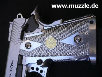 Die “HiCapa A-Type”-Pistole ist optisch ganz auf eine sportlich-kompakte Großkaliberwaffe getrimmt, und erinnert formal an einen geschrumpften Colt Government mit dem Beavertail)* und den großen Sicherungs- flügeln auf beiden Seiten. )* Beavertail = Handschutz oberhalb des Griffrückens, der die Schusshand vor Verletzungen durch den repetierenden Schlitten und den gespannten Hahn schützt, bzw. der verhindert, dass die Hand u. U. versehentlich die Waffenfunktion beeinträchtigt.