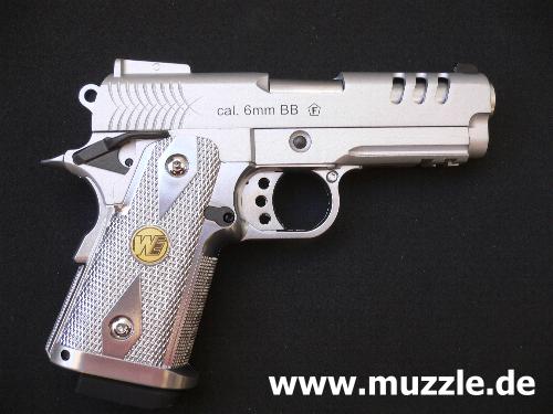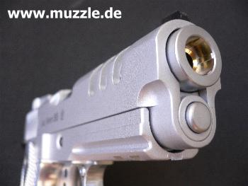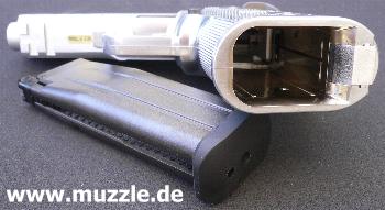 Visierung: nicht justierbar Sicherung: Handballenabzugssicherung und manueller Schwenkhebel (beidseitig), mit dem man den gespannten Hahn sperren kann Funktionalität: Alle Bedienteile sind mit der Originalffunktionalität belegt Ausführung: Schlitten und Rahmen Druckguss mit Nickelfinish, Lauf Messing, Laufmantel Aluminium, Griffstück Plastik Lieferumfang: Waffe im Pappkarton, Manual Zubehör: CO2-Magazin Preis: ca. 110,- EUR als GBB