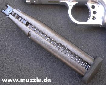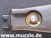 Bild unten: Blick von unten in den Griff (Magazinschacht) bei entnommenem Magazin. Leider besteht das Griffstück in Gänze aus Plastik. Ein Griffstück aus Druckguss mit aufgesetzten Griffschalen wäre sicherlich schöner. Dann wäre es möglich die Plastikgriffschalen optional gegen solche aus Holz, Perlmutt oder anderen hochwertigen Werkstoffe auszutauschen.