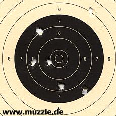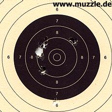 Das Für oder Wider GBB, bzw. CO2, ist nach meiner Überzeugung weniger in der Präzisionsaussage zu suchen, sondern eher im Bereich der Reichweite und den Begleitumständen im Schießbetrieb, sowie beim Handling. Da ist CO2 im Vorteil. Die sattere Schussabgabe, mit entsprechendem Impuls, sprechen nach meinem Empfinden ebenso für CO2 wie die Details im Umgang mit dem Magazin selber (siehe oben). Das Treibmittel ins Magazin zu bringen, geht beim Gastank schneller als bei CO2, dafür wird der höhere Aufwand aber mit größerer Kapazität belohnt. Das wegen der Kohlendioxidkartuschendimensionen weit aus dem Griff herausragende Magazin ist hingegen optisch sicher nicht jedermanns Sache. Letzten Endes ist das ganze wohl eine Frage der subjektiven Philosophie des Anwenders und nicht zuletzt auch der eigenen Bevorratung. Wer aus der Softair-Ecke kommt, wird lieber den gewohnten GBB-Weg gehen, der Druckluftschütze greift gerne zum CO2, welches er ja gemeinhin auch für seine CO2-Waffen im Kaliber 4,5 mm griffbereit hält. Nachfolgend zwei Zielscheiben (17 x 17 cm) aus den Testdurchgängen, aufgelegt gehaltene Waffe: Greengas, langsame Schussfolge, jeweils 6 Schuss