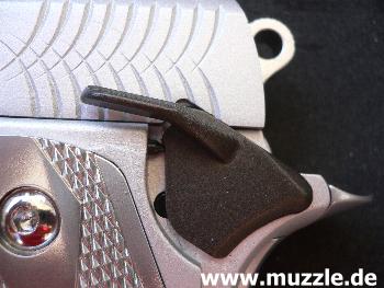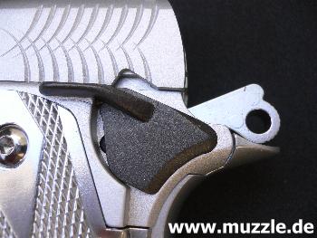 Abzug: Das durchbrochene halbmondförmige Abzugszüngel dreht sich beim Betätigen nicht um eine Achse, sondern gleitet dem Fingerdruck folgend nach hinten. Es handelt sich hier um einen SAO-Druckpunktabzug mit sehr geringem Vorzugsweg. (Bilder unten)