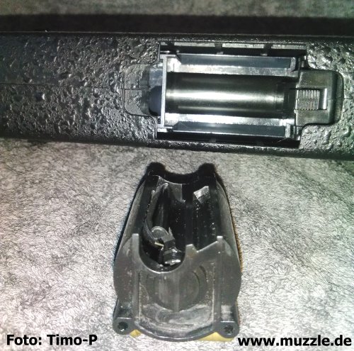 Bilder unten: Vor dem Wechsel der Magazinoptionen muss ein kleiner “Umbau” an der Waffe erfolgen, in dem man den Mag-Adapter entnimmt (Ladehülsenverwendung), respektive implementiert (Stangenmag)