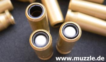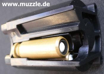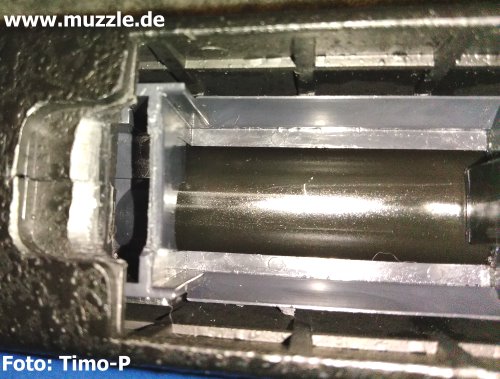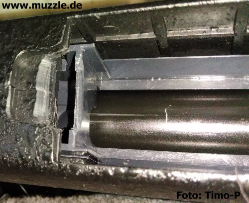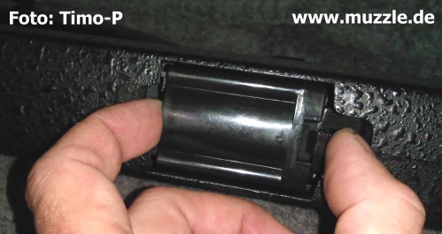 Trotzdem bleibt fest zu halten, dass das „Super X-9“ ein absolutes Spaßteil für das Zimmer-„Plinking“ ist. Auf der geschossenen Distanz von > 8 m ließen sich Getränkedosen und CDs zwar nicht lochen, Treffer waren jedoch stets eindeutig zu identifizieren. Bei allen Testdurchgängen mit unterschiedlichen Geschosssorten und –gewichten traten keine nennenswerten Funktionsstörungen auf. Weder bei der Verwendung der Ladehülsen, noch beim Durchrepetieren aus dem 26 (laut Manual 24) Kugeln fassenden Stangenmagazin. Funktional alles in allem eine tolle Sache mit einem einzigen Wermutstropfen: Der Magazinkasten für die Ladehülsen (Bild unten) sitzt so fest und tief im Schacht, dass er sich mit bloßen Fingern praktisch nicht aus dem Schaft entnehmen lässt. Ein geeignetes Werkzeug muss da jedes mal herhalten. Niemand erwartet von einem Kunststoffbauteil dieses geringen Gewichts, dass dieses beim Betätigen des Magazinhalters nun selbsttätig aus dem Schacht gleitet, aber ein problemloses Herausziehen ohne Hilfsmittel sollte möglich sein. Leider ist das nicht der Fall, aber dies ist auch der wirklich einzige Kritikpunkt beim ansonsten tollen Handling der Waffe. (Nachtrag September 2019: Modifikationen zur Optimierung des Magazinwechsels)
