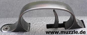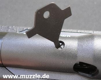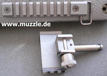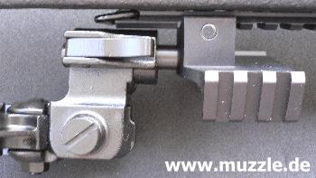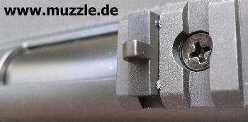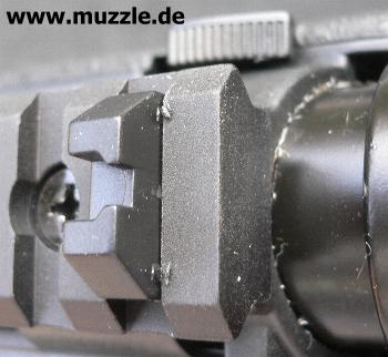 Bei den mitgelieferten Bauteilen Kimme und Korn handelt es sich um eine reine Behelfsvisierung. Die Kompo- nenten werden einfach in die Picatinny-Schiene gesteckt und sind dadurch nur horizontal justierbar und bilden eine zu kurze Visierlinie. (Bilder unten, links Korn, rechts Kimme)