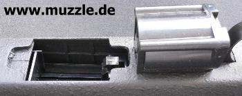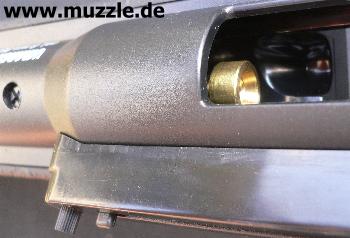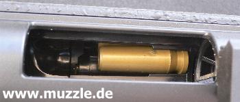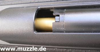 Bilder unten: Blick ins Auswurffenster beim Repetiervorgang und bei bestücktem Magazinkasten.
