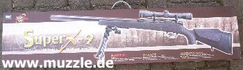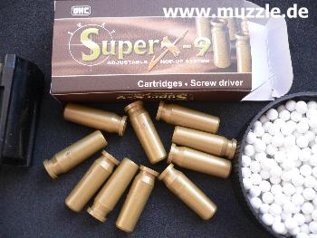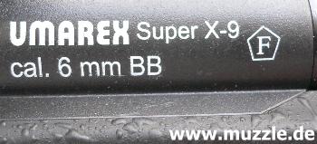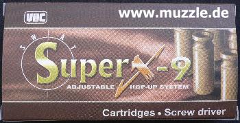 Hersteller: “UHC” - Unicorn Hobby Corporation (Taiwan), Hersteller seit 1986 Importeur / Anbieter: “UMAREX” (Deutschland) Modell: “Super X-9” Kaliber: 6 mm BB Energie: max. 1,25 Joule System: Softair Federdruckrepetierer, HopUp (ShootUp) justierbar )* )* HopUp = Vorrichtung (Walzen am Laufansatz) in Softairwaffen, die abgefeuerte BBs in eine Rotations- bewegung versetzt. Das dadurch herbeigeführte strömungsgünstigere Verhalten der Geschosse hat eine stabilere Flugbahn, bessere Präzision und eine größere Reichweite zur Folge.