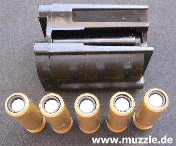 Es stehen zwei Magazinoptionen zur Auswahl, von denen das Stangenmagazin mit 26 ladbaren Kugeln zwar den absoluten Kapazitätsvorsprung für sich verbuchen kann (vier Bilder oben), dennoch bietet die Verwen- dung des 5er-Magazins für die Ladehülsen den ultimativen Spaßvorteil. So wird die zuletzt entleerte Hülse beim nächsten Repetiervorgang seitlich aus dem sich öffnenden Auswurffenster herauskatapultiert, bevor die nächste der maximal 5 Hülsen deren vorherigen Platz einnimmt.