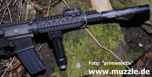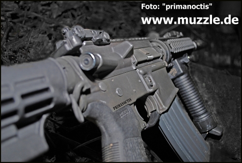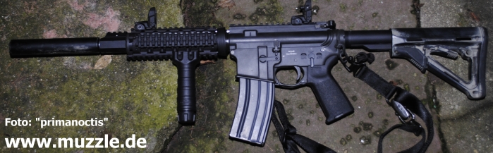 Umbau: Da ich hier mein spezifisches Modell vorstelle, möchte ich ein wenig auf den Umbau eingehen. Was ich jedem empfehlen kann, sind allgemein die Ra-Tech Tuningteile. Was man verbauen mag, muss jeder für sich entscheiden. Wer nicht viel Geld in die Hand nehmen möchte, sollte sich jedoch trotz allem das Hop Up "Gummi" aus Silikon anschaffen und einbauen, wenn er nicht gerade auf Zimmerdistanzen schießt. Dringend anzuraten ist der Austausch einiger Teile, die auch bei mir Ersetzt wurden. Wie oben schon erwähnt, bezieht sich das auf das Charging Handle und den Bolt Catch. Beide sind ohne große Kenntnisse und in kurzer Zeit zu ersetzen. Die von mir (äußerlich) angebrachten oder ausgetauschten Teile in der Übersicht (von vorne nach hinten): Classic Army Double Screw Silencer Crush Washer (RS) Lock Washer von DPMS (RS) Gas Block von Young Mfg (RS) Schwarzes Halteblech von DPMS (RS) Surefire M73 RIS (RS) Surefire Ladder Railcovers / Magpul XTM Railcovers (RS) / Sandgestrahlte KAC Style Railcovers (China) Magpul RSA (RS) Barrel Nut und Delta Ring Assembly (RS) Grip Pod GPS02 (Military Version) (RS) / Tango Down schwerer Vordergriff (RS) Magpul Flip Up Iron Sights Gen. 2 (RS) Magpul MOE Abzugsbügel (RS) Dust Cover Set (RS) Barrel Nut (RS) Delta Ring Set (RS) Magpul Ziehhilfen, 9x (RS) Bushnell Holo Sight Gen. 1 (RS) Magpul Back Up Sights (RS) Magpul MOE Pistolengriff (RS) Magpul ASAP (RS) Magpul MS2 Sling (RS) VLTOR Buffer Tube (RS) Magpul CTR Schaft (RS) Bundeswehr Panzertape und eine Kugelschreiberfeder ;-) Alle Magpul Dinge sind original und Made in USA, nicht die PTS Billigheimer aus China.