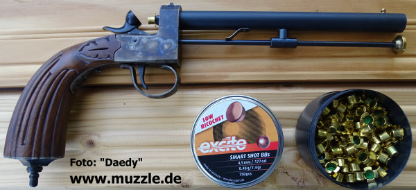 fingernagelgroßen Stück Zellstoff im Lauf fixiert werden. Auf 10 m ist ein gutes Schussbild zu erreichen. Besonders wer den Schussknall liebt, liegt mit der kleinen Waffe richtig.