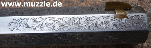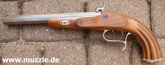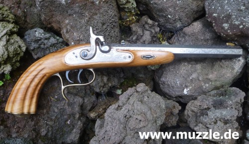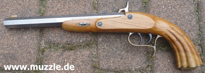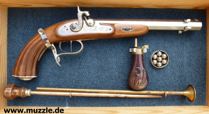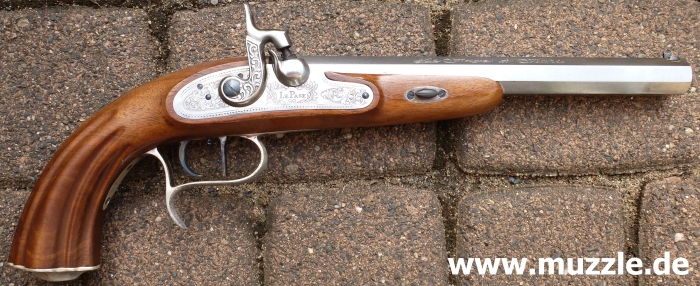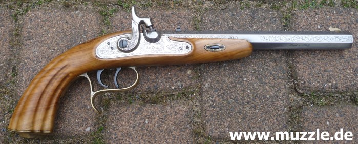 Hersteller: “P. Bondini” - Made in Italy Replika nach dem Original des berühmten französischen Büchsenmachers Henry Le Page (1792-1854) Typ: Vorderlader, Perkussionspistole (Schwarzpulver/Zündhütchen) Seriennr.: L 4472 Kaliber: .31 Länge: 405 mm Höhe: 155 mm Breite: 41 mm Gewicht: 1.180 g Ausführung: Gefluteter Nussbaum-Holzgriff, Schlossplatte und Achtkantlauf reich graviert, gezogener Präzi- sionslauf (vermutlich aus “Lothar-Walther”-Fertigung), Stecher-Abzug (double set trigger)