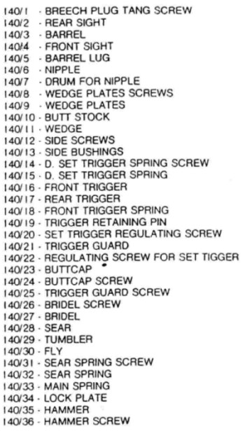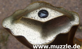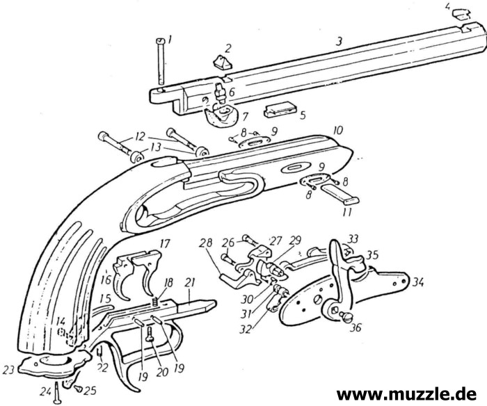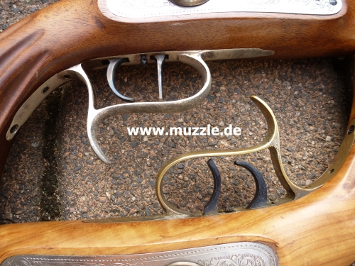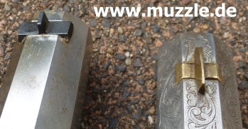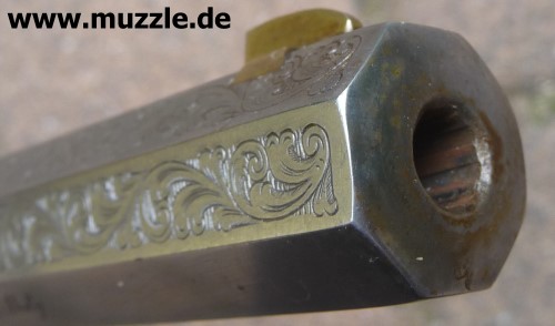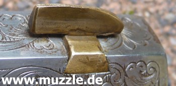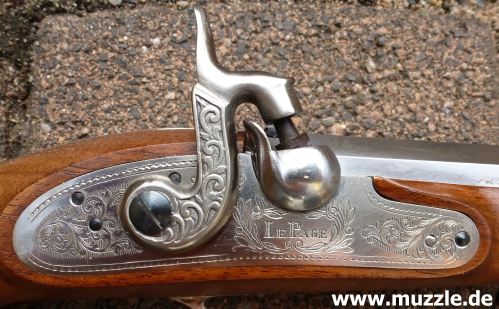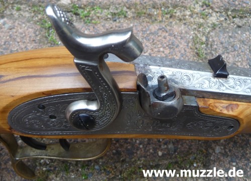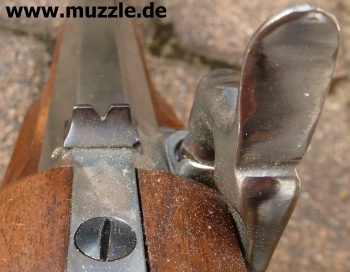 Bilder unten: Blick auf Hahn und Piston Funktionsweise: Das Zündhütchen (nicht im Bild) wird auf das Piston aufgesetzt. Der nach Abzugsbetätigung darauf aufschlagende Hahn setzt Funken oder einen Feuerstrahl frei, der durch die Röhre im Piston in den Lauf dringt und dort die Treibladung (vorher eingebrachte adäquate Menge Schwarzpulver) zündet. Diese ist nach vorne durch ein sogenanntes Schusspflaster abgedichtet. Das eingepresste Bleigeschoss wird durch die explosionsartige Entzündung des Schwarzpulvers mit Wucht aus dem Lauf getrieben und durch die Laufzüge in Drall versetzt, um die Projektilflugbahn zu stabilisieren und damit dessen Reichweite zu erhöhen.