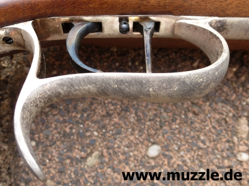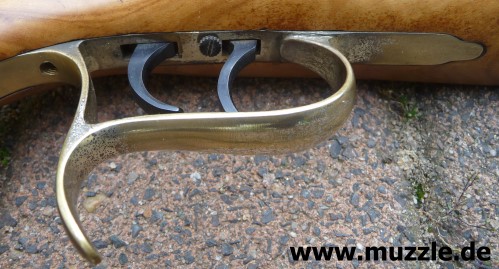 Foto unten: Der Stecherabzug. Beim Stecherabzug wird durch das vorherige „Einstechen“ eine Feder im Abzug vorgespannt und damit der Abzugswiderstand verringert (indirekte Kraftübertragung). Der Stecher sitzt hinter dem Abzugszüngel.