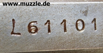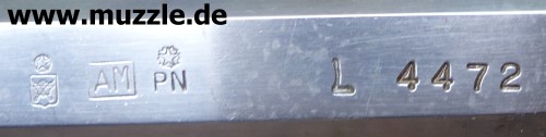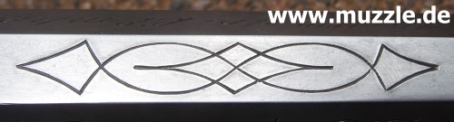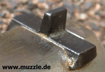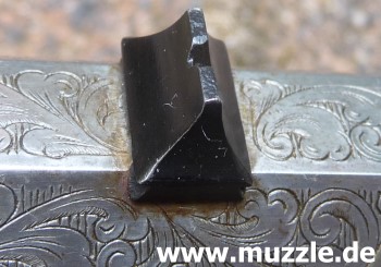 Bilder unten: Die offene Visierung. Kimme (links) und Korn (rechts) sind beide in den Laufmantel eingepasst (“Schwalbenschwanzpassung”).