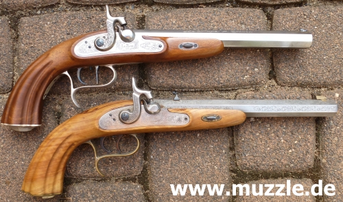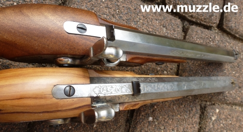 Visueller Vergleich der “Le Page”-Pistolen “Armi-Sport” (dunkler Holzgriff) und “Bondini” (heller Holzgriff)