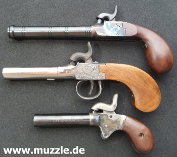 Fotos unten: Links, v. o. n. u. “Riverboat”-, “Mc Nab” und “Abilene”-Derringer. Rechts: Größenvergleich. Linke