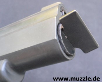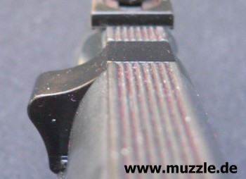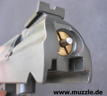Bilder unten: Heckansicht mit dem Ventilstößel. Trifft der Hahn beim Abschlagen der Waffe auf den Stößel, wird