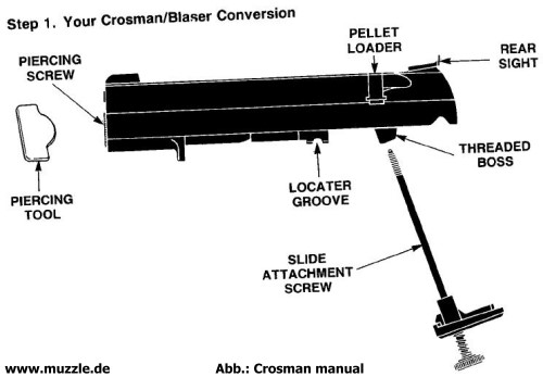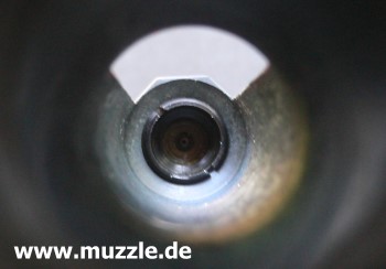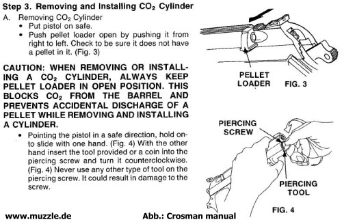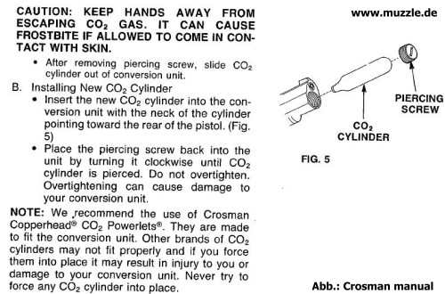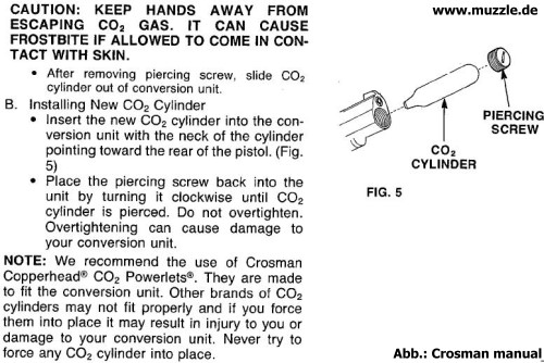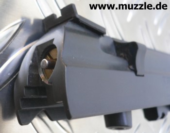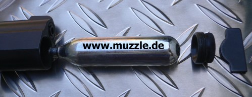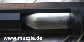 Die CO2-Kartusche wird, wie bei vielen handelsüblichen Druckluftwaffen auch, unterhalb der Mündung in den Schacht zum Ventil geführt.
