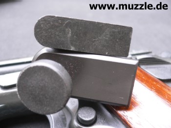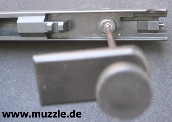 Laufbüchse und Vorholfeder werden demontiert - kann das “Blaser”-System bündig aufgesetzt werden. Natürlich unter Verwendung des vorher entnommenen Schlittenfanghebels. Die lange Befestigungsschraube
