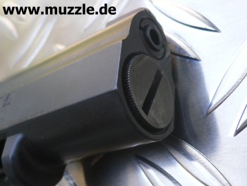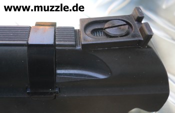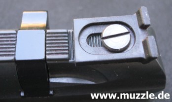 Bilder oben: Die seiten- und höhenverstellbare Kimme ist mit einer Schlitzschraube auf den angeschrägten