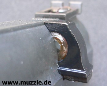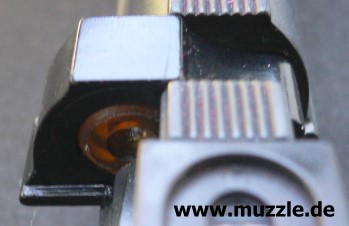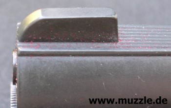 Foto oben: Statisches Korn, 5 mm hoch, 3 mm breit. Zwischen Kimme und Korn verläuft eine gerillte