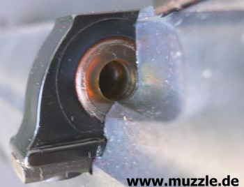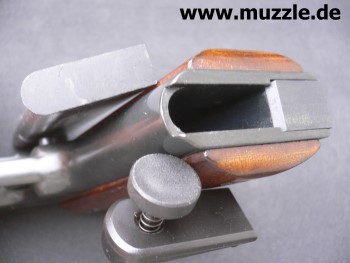 Bilder oben: Ansicht jeweils von vorne (Mündungsansicht). Foto rechts: Schieber zum Laden aus dem System