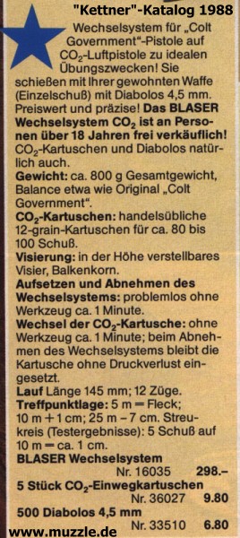 doch wohl reine Kinderspielzeuge!” - Heute natürlich auch ein Problem: Das “Blaser”-CO2-Wechselsystem ist im Handel längst nicht mehr erhältlich und gilt mittlerweile als Sammlerstück. Wohl dem, der noch ein gut bis sehr gut