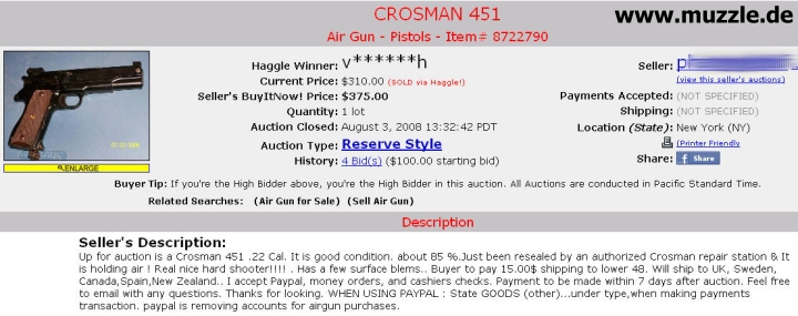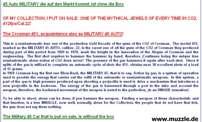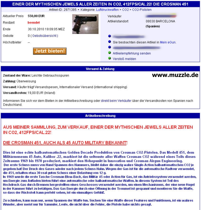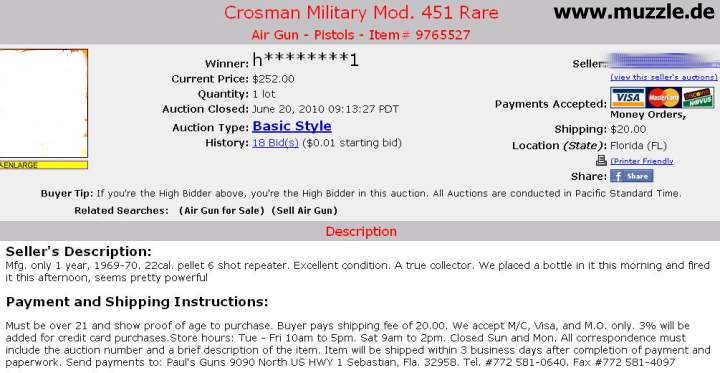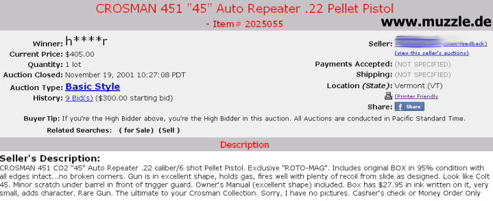 Bemerkung: Pistole ist sehr selten. “Crosman”-Modell mit der kleinsten Auflage dieses Herstellers. Waffe gilt