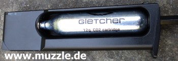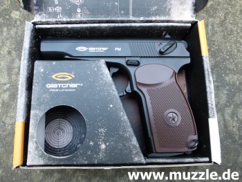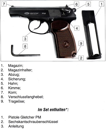 Länge: 160 mm Höhe: 127 mm Breite: 30 mm Gewicht: 794 g (leer) Ausführung: Vollmetallgehäuse (Zinkdruckguss), Magazinbauteil aus Metall, Kunststoffgriffschalen Ausstattung: Kein Blowback – kein beweglicher Schlitten - entnehmbares Metallmagazin (BB-Stangenmagazin mit Kapselaufnahme im Griffstück) - starre Visierung Lieferumfang: Pistole mit Manual und Inbusschlüssel im Pappkarton Bemerkungen: Der Schlittenfanghebel und der Abzugsbügel, der beim Großkalibervorbild auch als Zerlegehebel dient, sind bei der “Gletcher PM”-CO2-Pistole lediglich Fakes ohne Funktion. Gleiches gilt für den angesetzten Hahnsporn Bewertung: Saubere, äußere Verarbeitungsqualität - Preis-Leistungs-Verhältnis befriedigend Preis 2013: ca. 95,- bis 140,- EUR (Internetfachhandel) - Preisvergleiche lohnen sich!