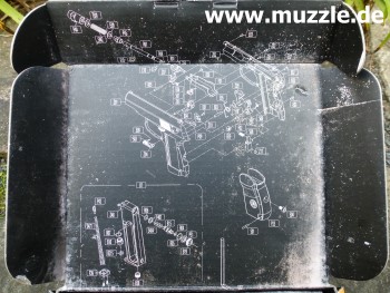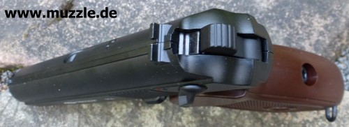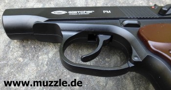 Abzug / “Non Blow-Back” Fotos unten: Die “Gletcher PM” besitzt einen reinen Spannabzug (DAO), kann also nicht im SA-Modus geschossen werden. Der Schlitten ist fest montiert, eine “Blow-Back”-Funktion entsprechend nicht vorhanden. Der Abzugsbügel dient beim “scharfen” Vorbild (wie z. B. auch bei der “Walther PPK”) als Zerlegehebel, ist aber an dieser CO2-Nachbildung lediglich ein Fake. Siehe Fotos unten.