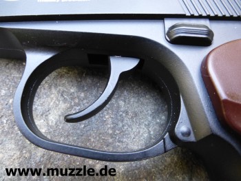 DAO-Abzugscharakteristik: Dem langen und wegen des Kugeltransports etwas kratzig-schabenden Vor- zugsweg, bei ansteigendem Widerstand, folgt eine unvermittelte Schussauslösung ohne Druckpunkt und ohne Nachzugsweg. Das Züngel ist m. E. etwas zu schmal ausgeführt, sodass sich dies am Abzugsfinger auf Dauer mit einer unangenehmen Druckstelle bemerkbar macht.