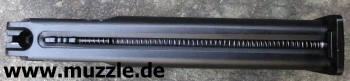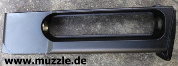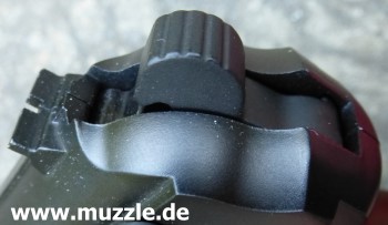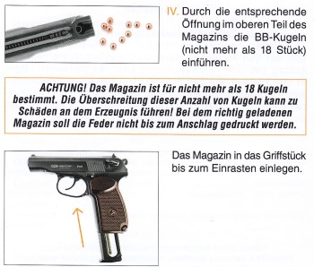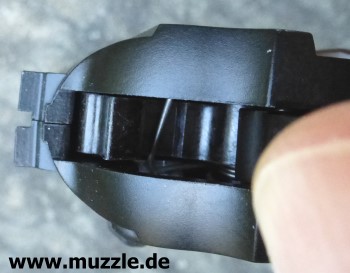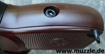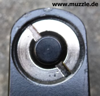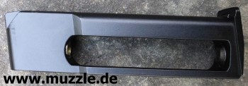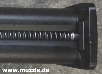 Zum Laden der 18 Kugeln durch die Öffnung im Magazinkopf drückt man den federbelasteten Zuführer nach unten. Leider gibt es keine Rastung, sodass dieser beim Ladevorgang permanent manuell unten gehalten werden muss. Sehr unkomfortabel und traurig, dass soetwas dem Anwender auch bei neuen Modellen immernoch zugemutet wird. Mit einer einfachen Randkerbung als Halterung, wie sie heute bei den meisten Pistolenmodellen angeboten wird, wäre das Problem gelöst.