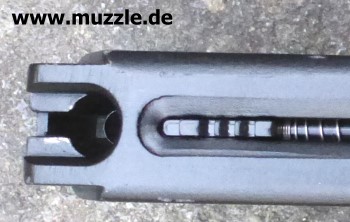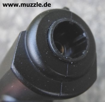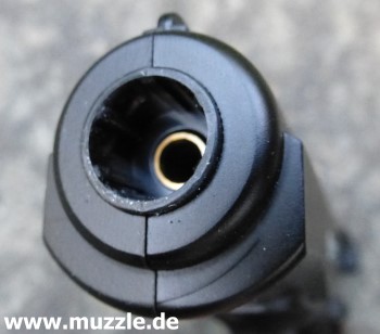 Fotos unten: Mündungsansichten. Deutlich sichtbar ist der unschöne Spalt zwischen den beiden Gehäusehälf- ten.