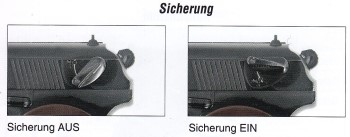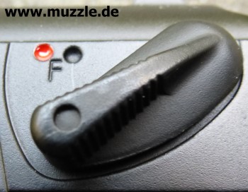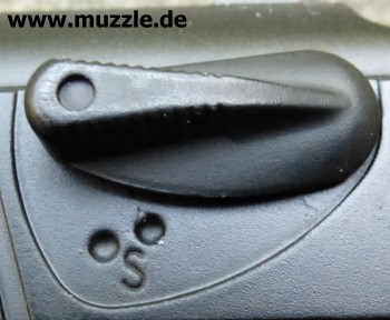 Sicherung Die Pistole ist mit einer nur linksseitig zu betätigenden, manuellen Sicherung ausgerüstet. Wird der Schwenkhebel in die obere Position gebracht (safe = roter Punkt verdeckt, “S” sichtbar), unterbricht dies die Abzugsmechanik, das Züngel kann gegen einen nur noch geringen Widerstand betätigt werden. In der unteren Position (F = fire), der rote Punkt liegt frei, befindet sich die Waffe im Status “ungesichert” und wäre entsprechend schussbereit.