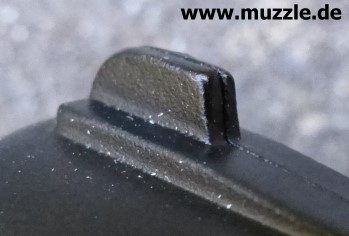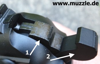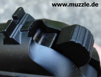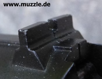 Visierung Fotos unten: Die offene Visierung der “Gletcher PM” ist leider nicht justierbar. Der Visierkontrast ist dürftig und der Kimmenausschnitt arg klein geraten. Eine Vorrichtung (z. B. “Picatinny”-Rail) für den Anbau optischer Zielhilfen ist nicht vorhanden.